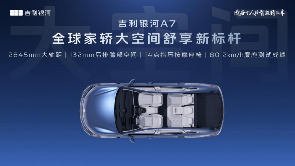 吉利银河 A7 实现全球最低 2L 级馈电油耗、2100+km 超长续航、2845mm 超长轴距,于一身,打造全球家轿节能续航新标杆、大空间舒享新标杆。